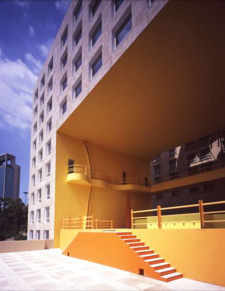 It was developed in one of the busiest areas of Mexico City: Paseo de la Reforma. Its morphology is characterized by shades of natural stone on its steep exterior walls and its corridors which seem like terraces from above, illuminated by a saffron shade that transports you to a primitive and communal time when men lived by fire.