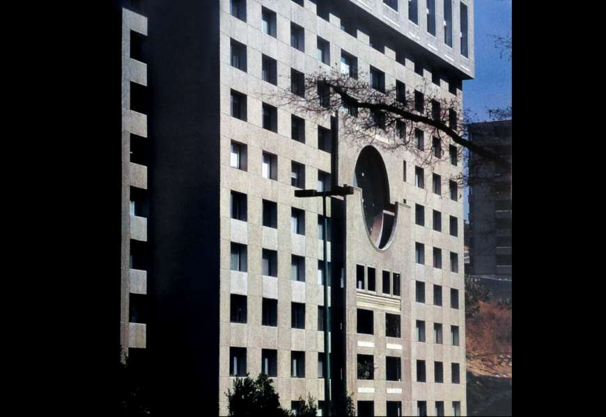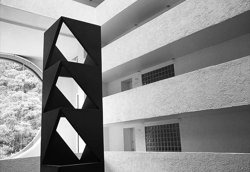 Esta obra bien podría ser parte de cualquier metrópoli del mundo, pero es en Bosques de las Lomas, Ciudad de México, donde esta construcción de colores grisáceos se erige.